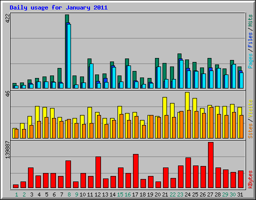 Day | Hits | Files | Pages | Visits | Sites | KBytes | ||||||